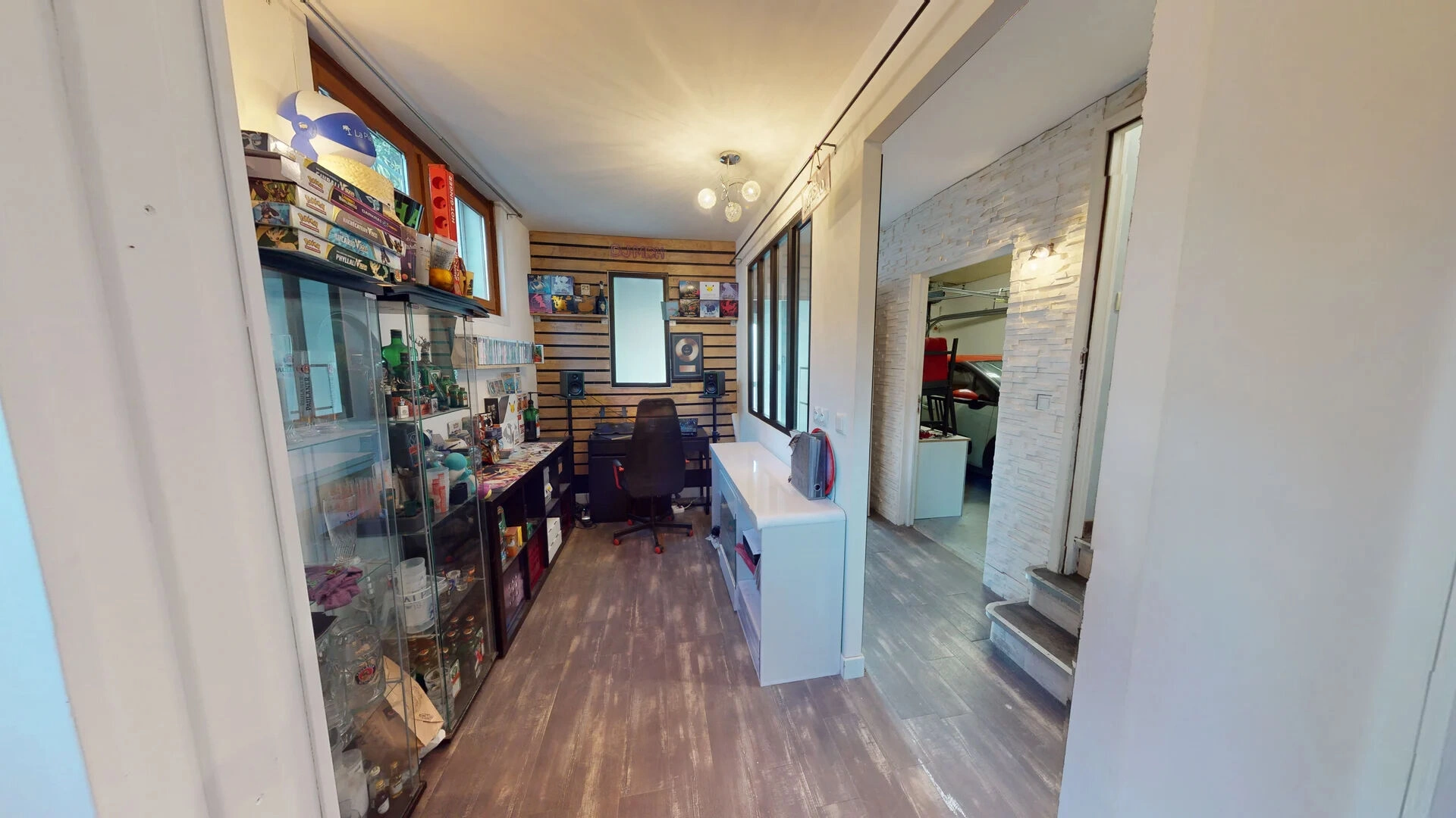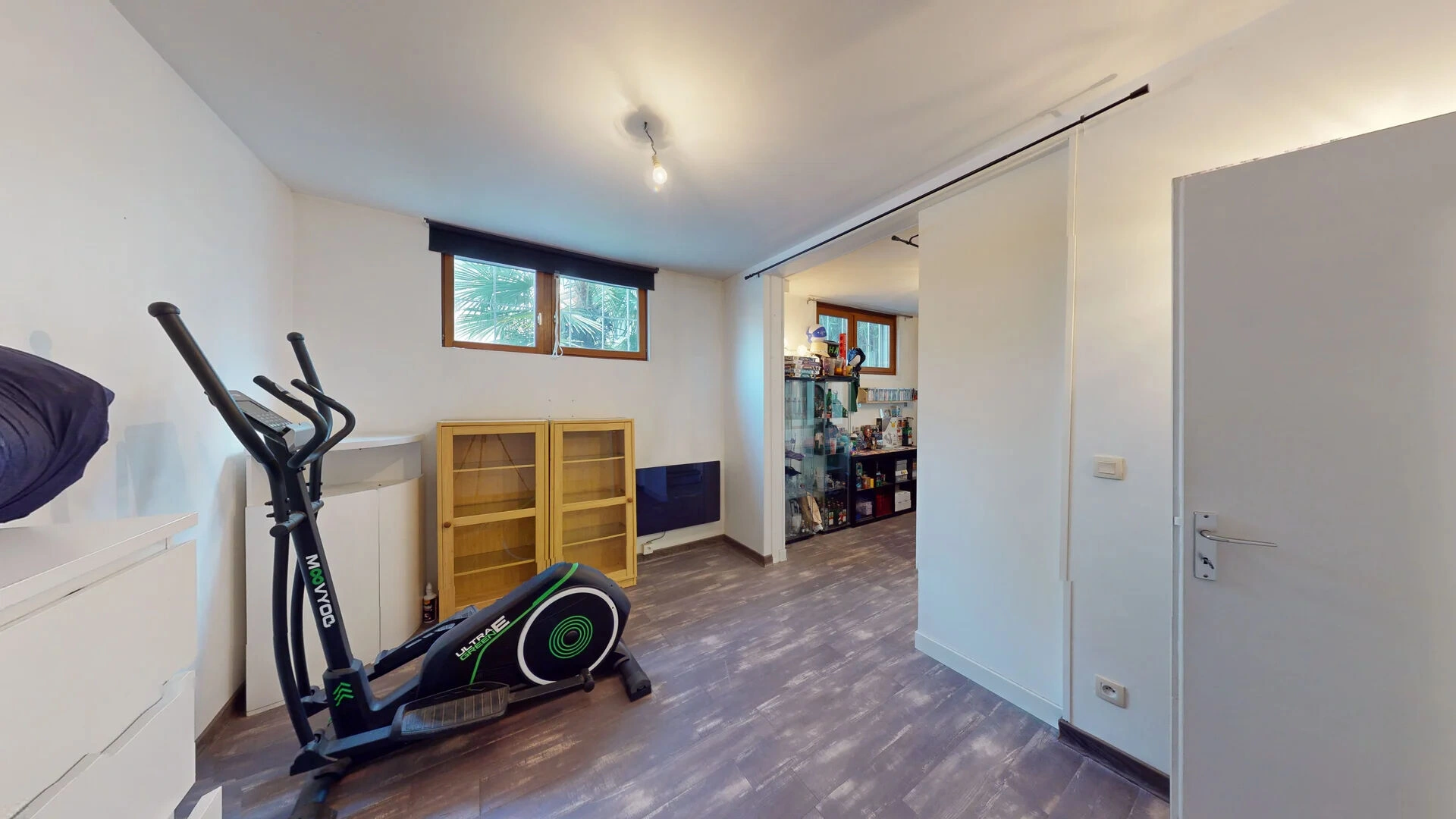 Au rez-de-chaussée : un hall d'entrée, un garage avec porte électrique, un accès à la cave. Une chambre avec salle d'eau, WC, dressing et un bureau. Facilement aménageable en studio.